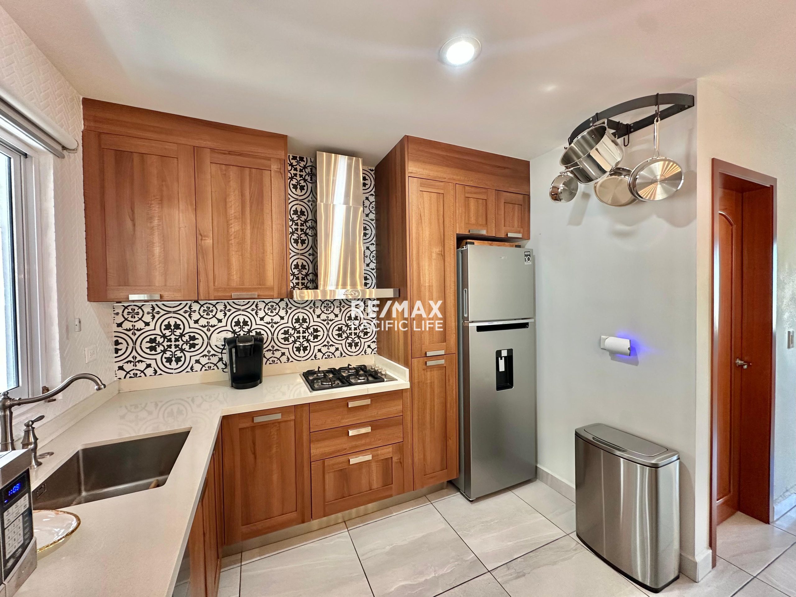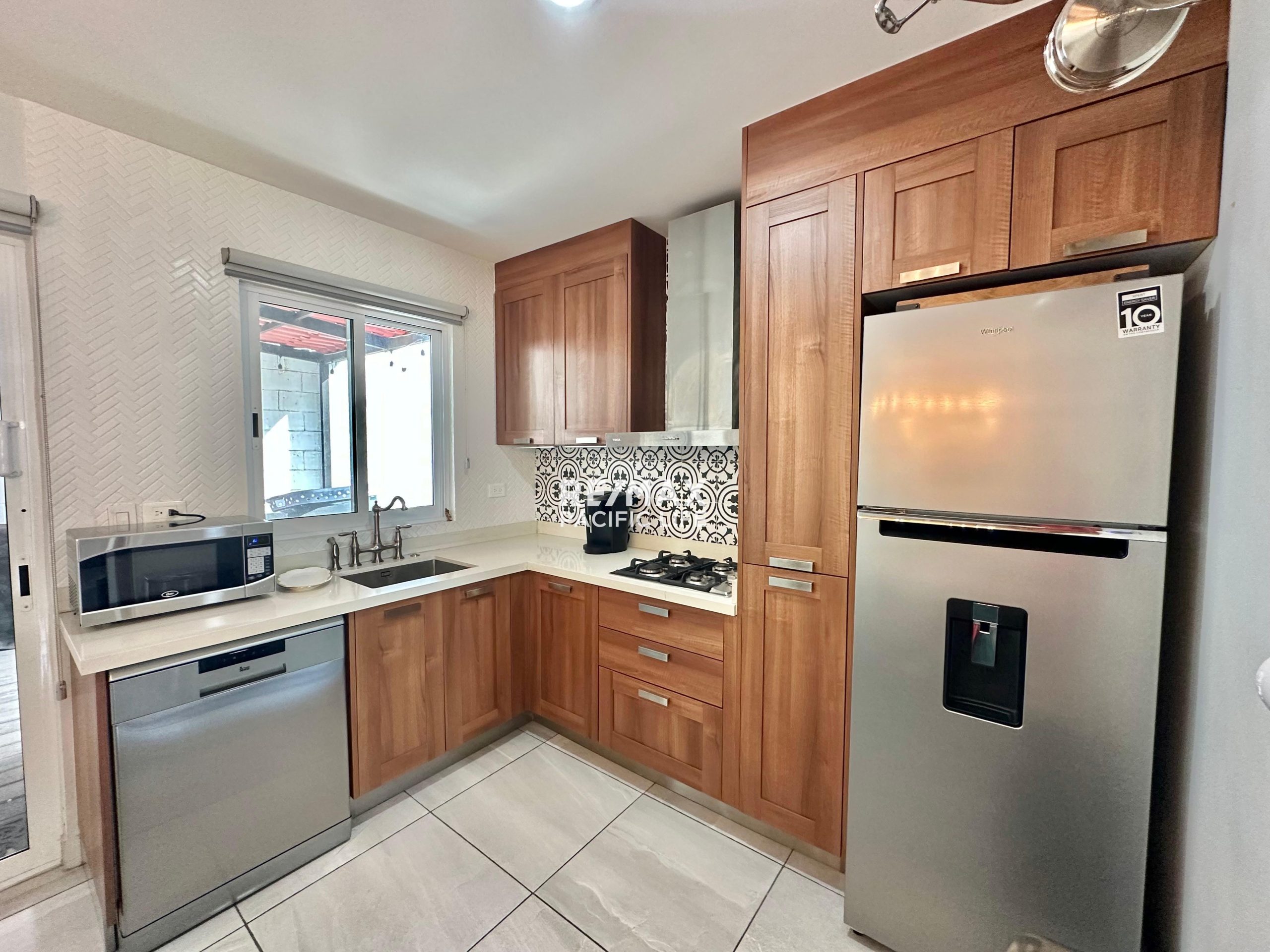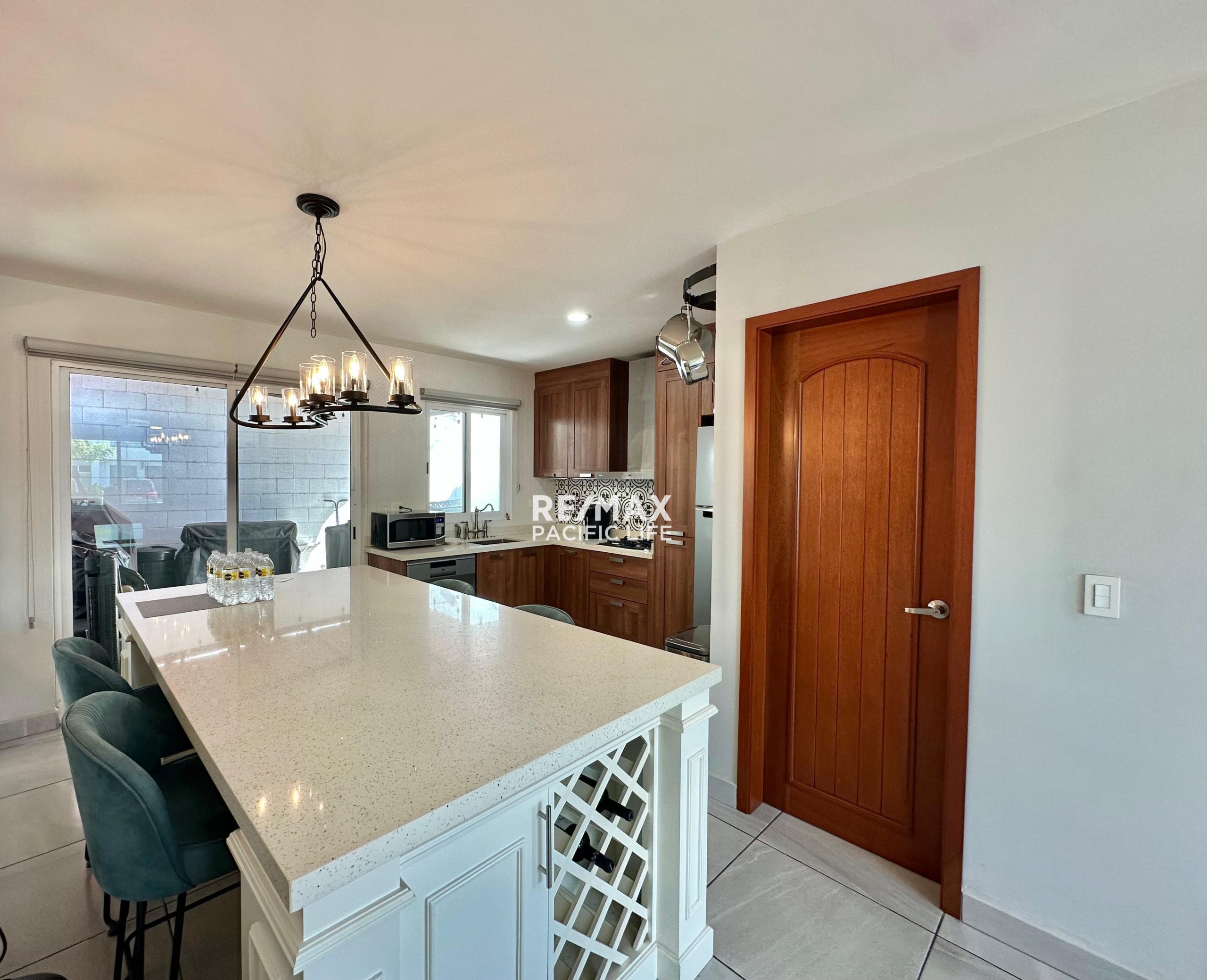La cocina está completamente equipada, incluyendo lavavajillas, barra de granito y finos acabados en madera de cedro, ideal para quienes disfrutan cocinar y recibir visitas, con amplio desayunador.