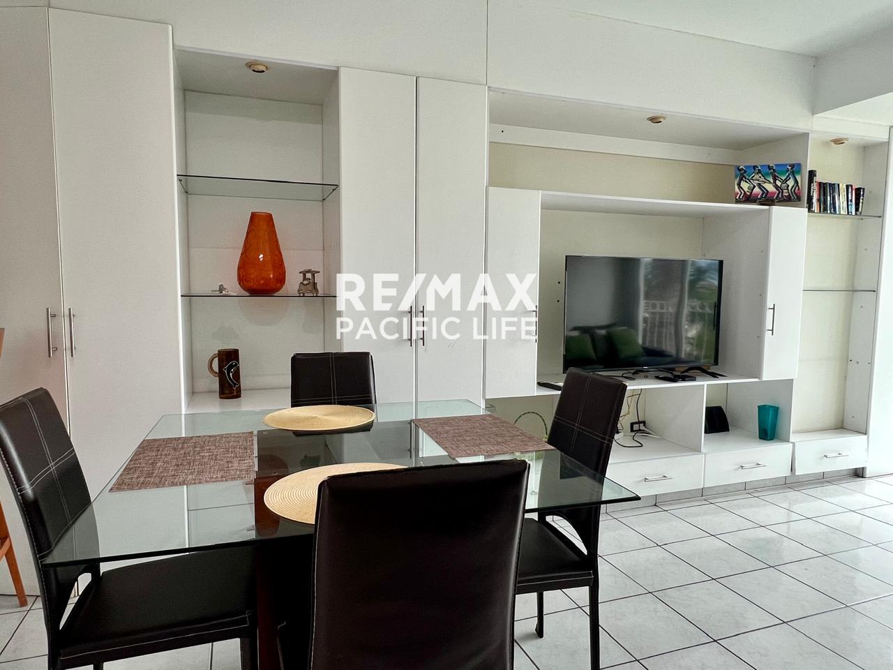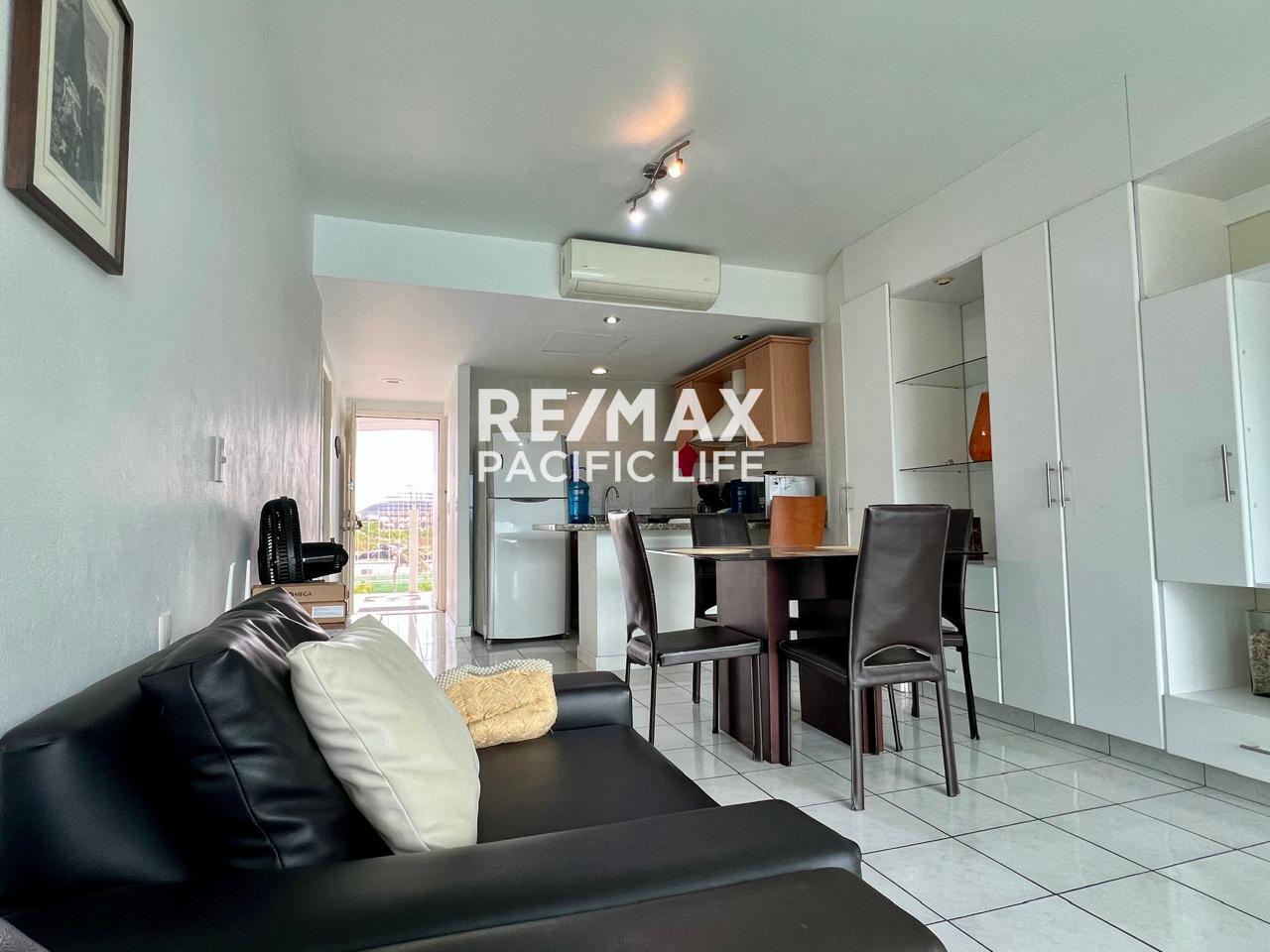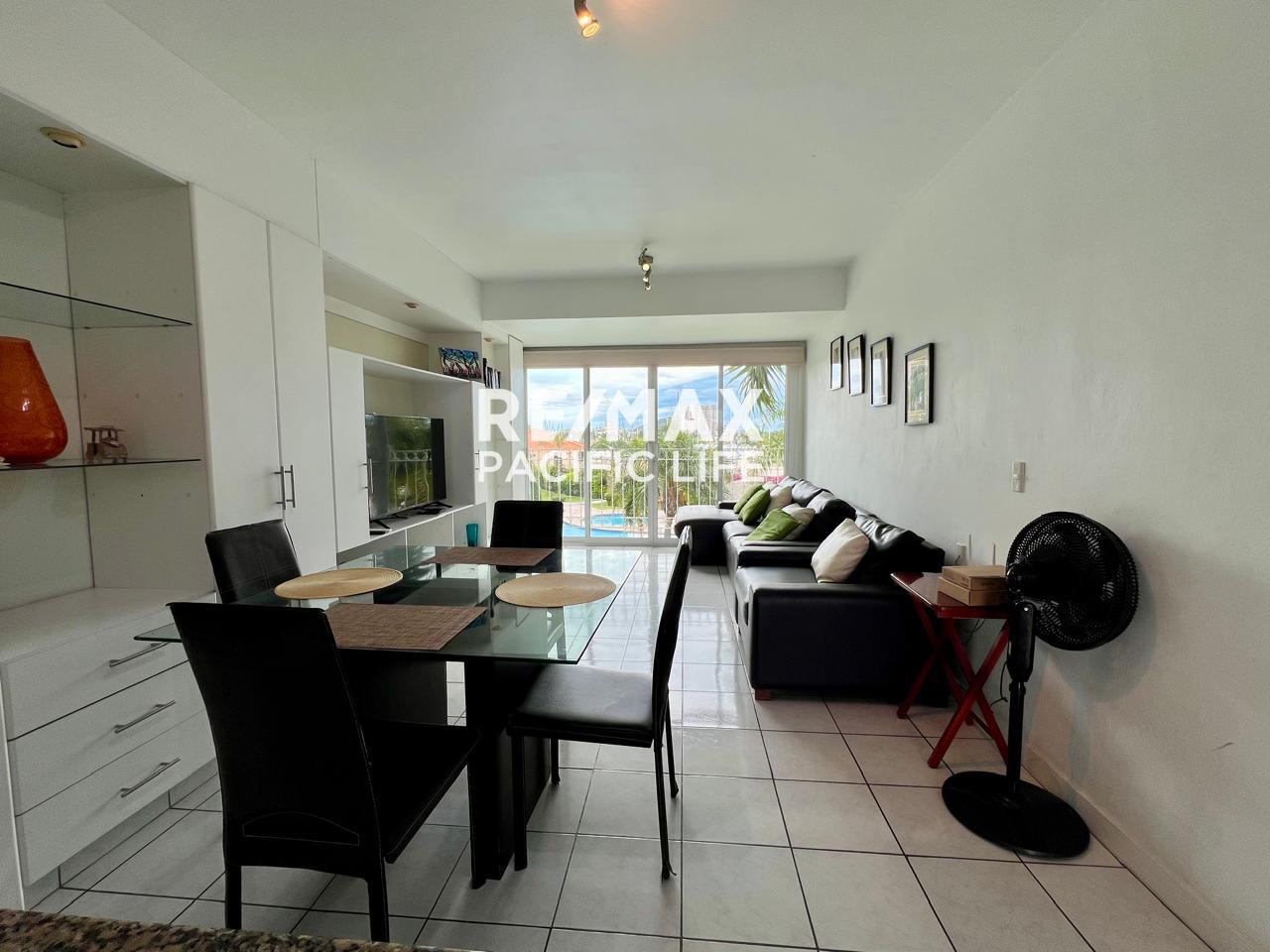 El departamento incluye aire acondicionado, cocina equipada, área de sala con vista hacia las albercas y jardines del complejo, así como internet y mantenimiento incluidos en la renta.